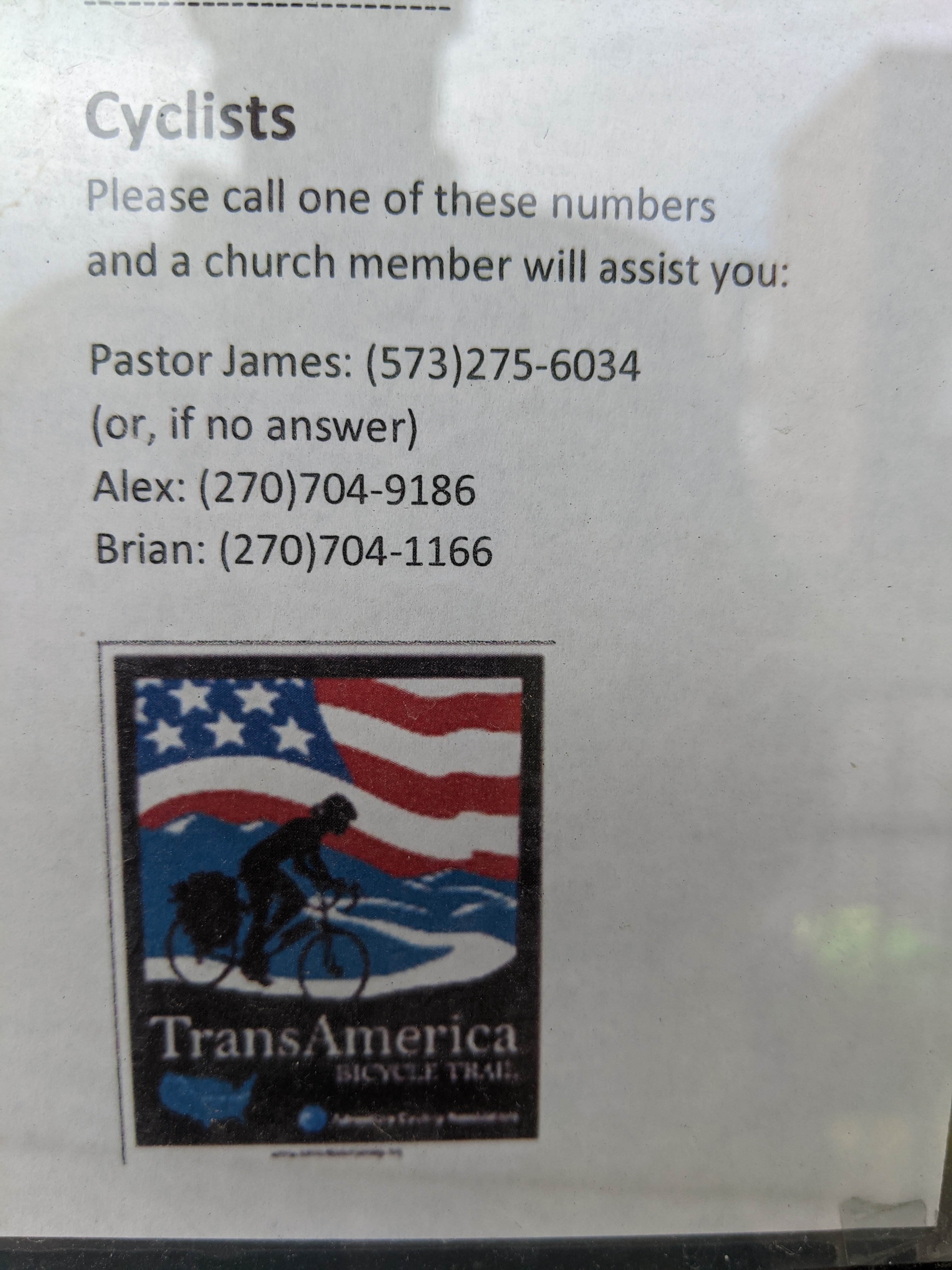 That night I stayed in the Marion United Methodist Church. The pastor's phone number was on the church door, and being a Sunday afternoon, I wonder if I would get him. Sure enough, 10 minutes later he came around and let me in. Apparently, the church had been offering cyclists accommodation since the TA was established in 1976. So, for 47 years, any cyclists, appearing at their doors, was offered free shelter, a bed, and most importantly, a shower: Christian values in action. They had stacks and stacks of visitors books to prove it. James, the pastor even took a picture of me and will stick it next to my entry. Looking back the most recent book, I saw a number of people I had met going either W-E or E-W. There must have been hundreds and hundreds of them over time. What an amazing service!